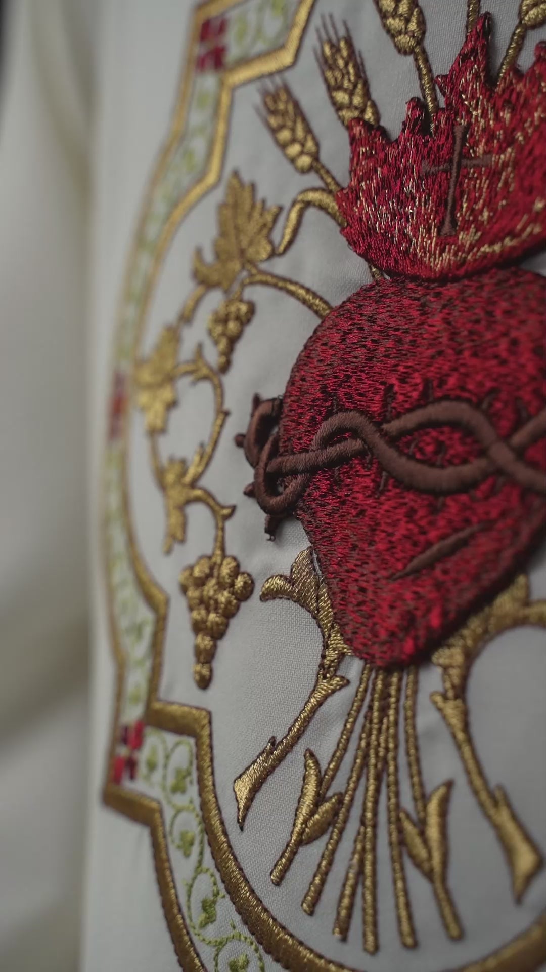 Rico bordado: La casulla está ricamente decorada con bordados, que muestran el símbolo del Corazón de Jesús, mientras que en la parte posterior de la casulla hay un motivo de un cáliz y una hostia. El bordado se realizó con hilos dorados y burdeos, aportando brillo y profundidad excepcionales a la casulla.