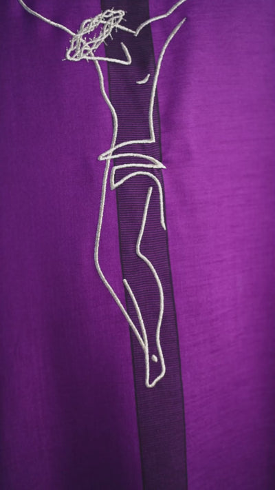 Casulla confeccionada en tejido de alta calidad con textura visible, decorada con bordados con motivos de la crucifixión de Jesús en la cruz. Cruz sublimada en todo el ancho de la casulla.