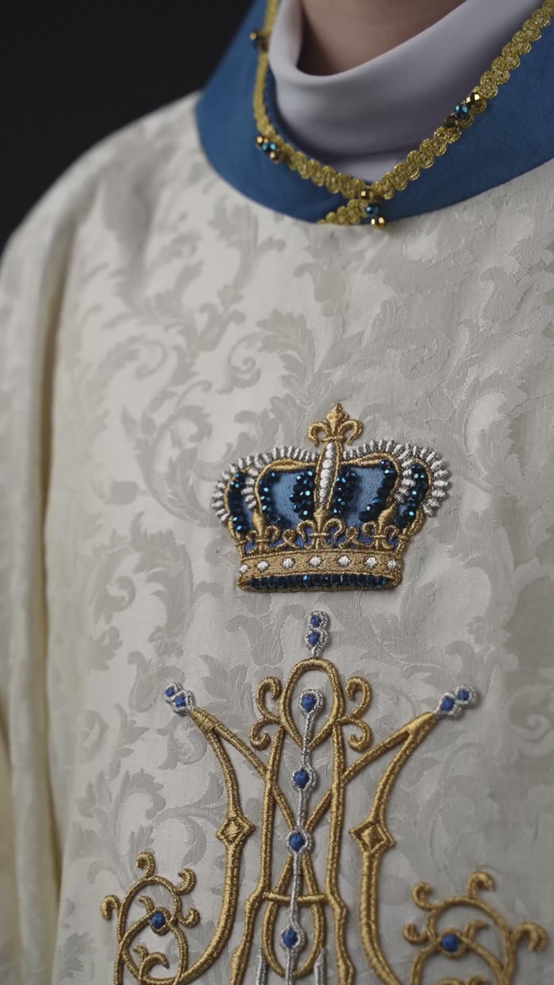 - Ricos adornos: Cintas italianas doradas realzan el cuello azul aterciopelado y los bordes de la casulla. Símbolo mariano ricamente bordado.