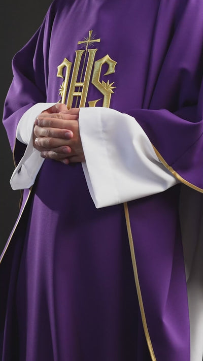 La casulla está confeccionada en tejido de alta calidad, decorada con un bordado con el símbolo eucarístico realizado con hilos de oro, que representa el símbolo IHS. Además, los bordes de la casulla están acabados con adornos dorados satinados, que combinan perfectamente con el símbolo IHS bordado en oro. Además, la casulla está disponible en todos los colores litúrgicos.
