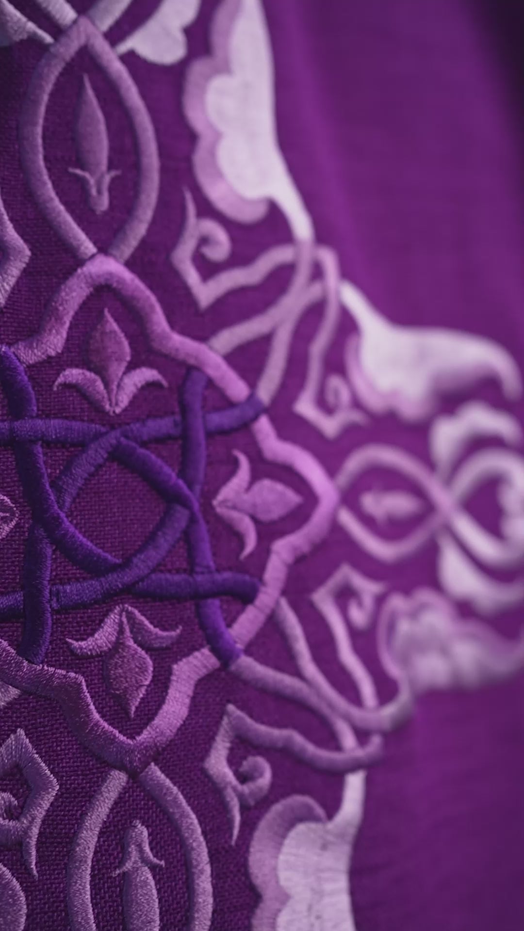 El tejido está hecho de 100% PE. La casulla está además decorada con bordados realizados con hilos de oro, que representan una cruz. El ribete del color de la casulla evita que el material se deshilache.