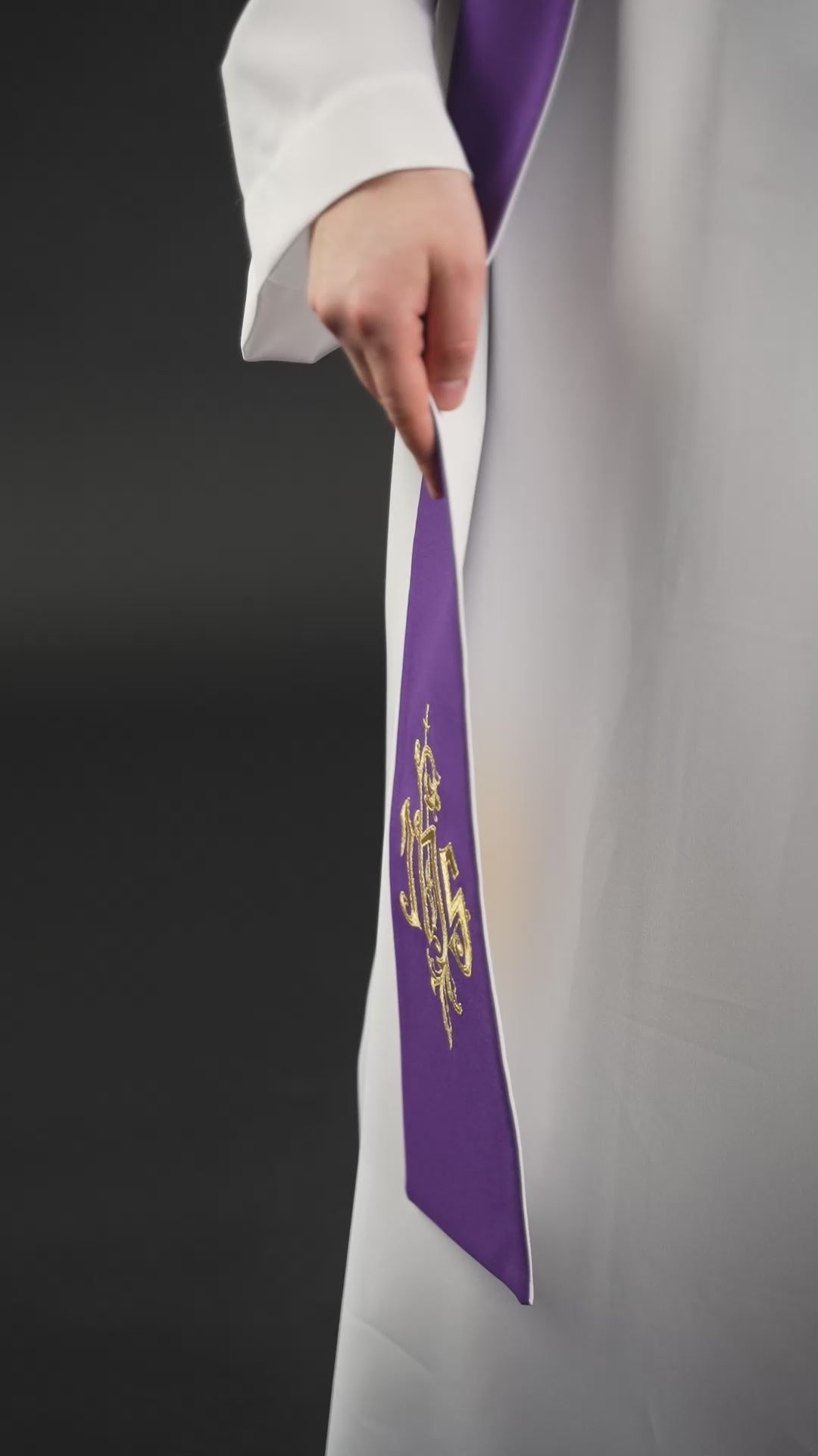 Una estola de doble cara y de una cara hecha de tela suave de alta calidad, decorada con un rico bordado con el símbolo IHS.