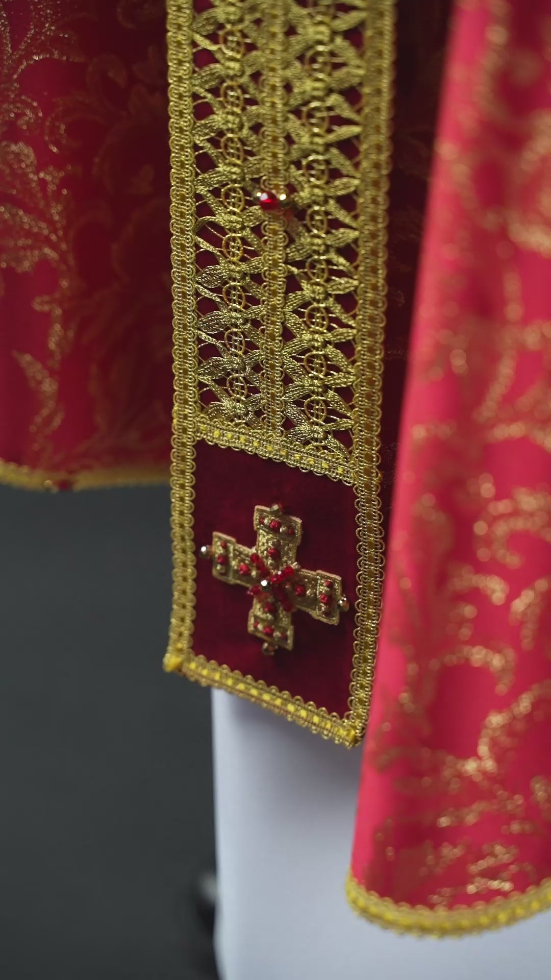 Esta casulla única es la esencia de nuestros 30 años de experiencia en la decoración de bordados. Confeccionada con tejido de la más alta calidad y decorada con piedras naturales cosidas a mano. Es la combinación perfecta de belleza y funcionalidad.